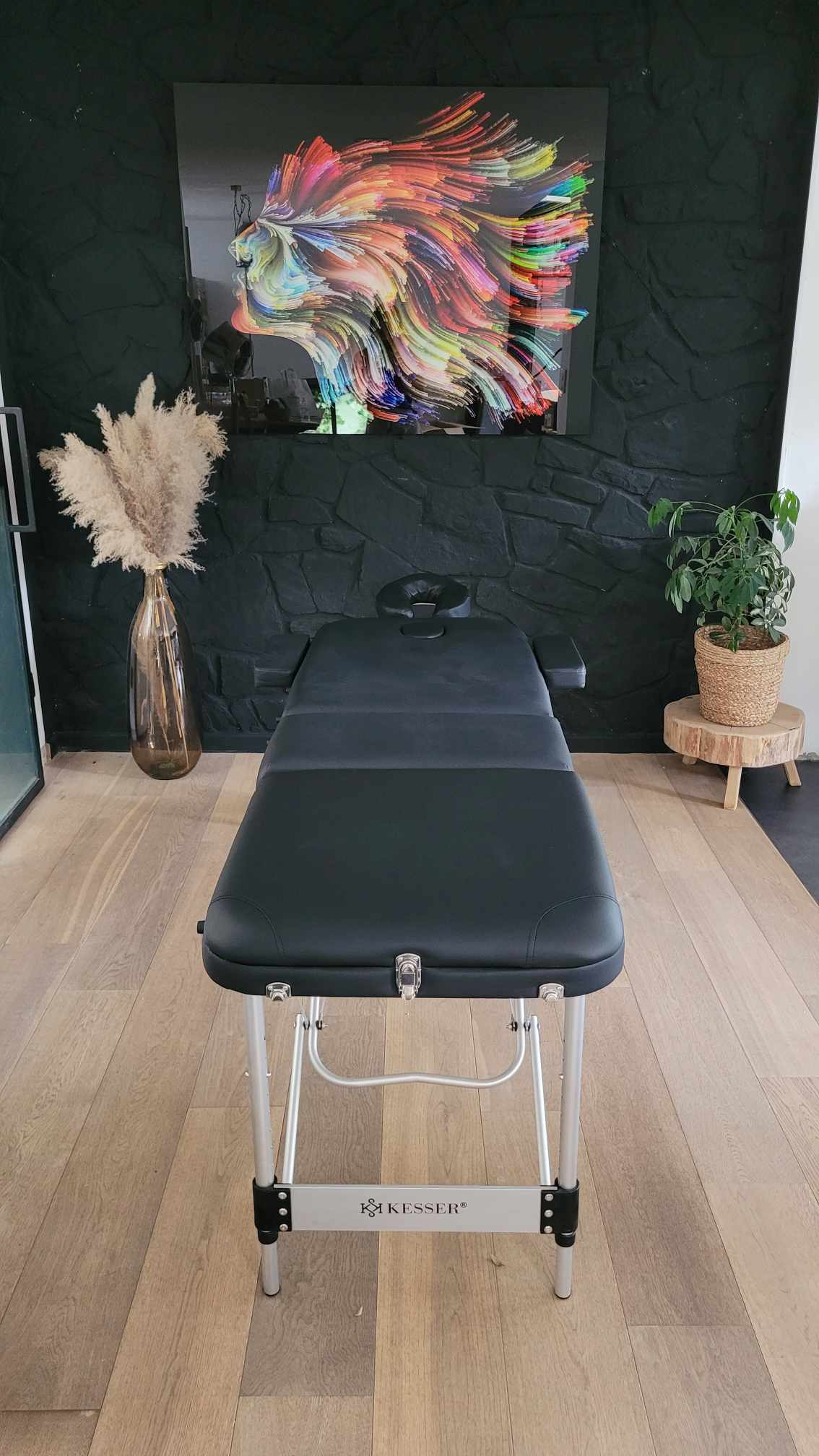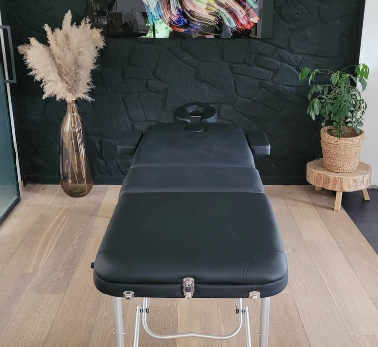 table de massage, essuies, serviettes chauffantes, huiles et musique d’ambiance.